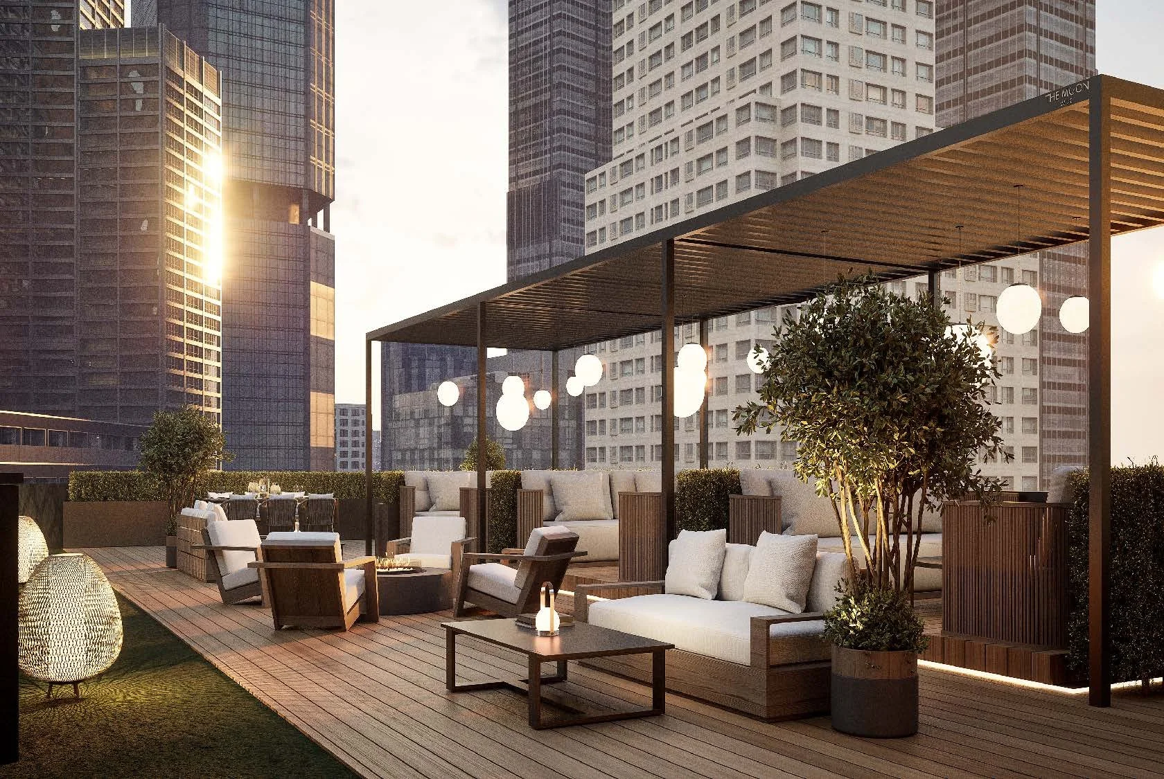 A landscaped rooftop sanctuary with skyline views, a covered pergola lounge, fire feature gathering area, and indoor and outdoor bar spaces creates an elevated setting for relaxation and entertaining.